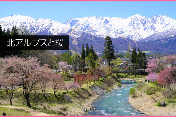 続いてご紹介するのは、白い残雪が映える春の北アルプスと桜のコントラストが楽しめるスポットです。