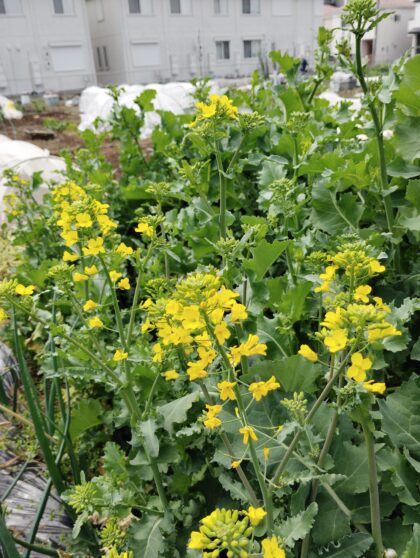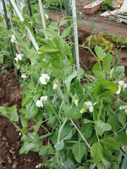 黄色の菜の花、絹さやの白い花
