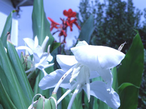 真っ白いジンジャーが久しぶりの太陽の光を浴びて輝いています。