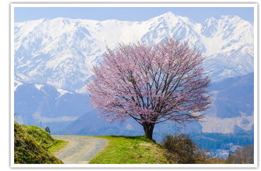 おすすめは長野県白馬村。画像は「野平(のだいら)の一本桜」です。遮るもののない高台の田園地帯に、ソメイヨシノが淡いピンクの花を咲かせ、背後の白馬三山との鮮やかなコントラストを描き出します。朝日に照らされる山々と桜の競演は、多くの写真家を魅了する神々しい光景です。村の素朴な原風景の中に息づく、春の白馬を象徴するような美しさを楽しめます。見頃は例年4月下旬から5月上旬にかけてです。