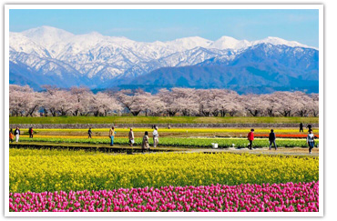 この地の大きな特徴は「春の四重奏」と呼ばれる景色に出会えること。その名の通り、4つの色彩が重なることで完成するこの風景の背後にそびえるのは、白く輝く残雪の北アルプス(朝日岳・白馬岳)。