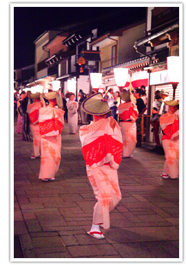 日が落ちて、涼しげな浴衣をまとった人々が編み笠を目深にかぶり、無言で優雅に舞いながら、ぼんぼりのついた街中をゆく…夏の終わりを感じさせてくれる、幻想的な風景が広がります。特に女性が舞う姿は絵になりますね。どこかせつない「越中おわら節」の旋律を奏でる胡弓の音色も、抒情たっぷりです。