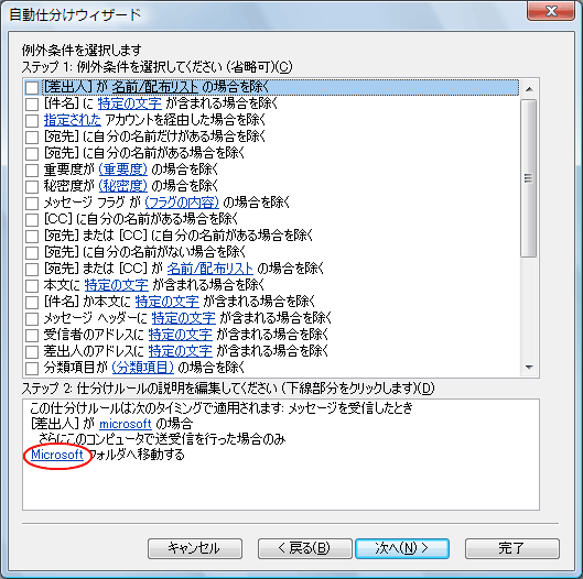 ※このルールをすぐ適用する場合は、「ステップ2」の「"受信トレイ"内のメッセージに仕分けルールを適用する(U)」にチェックを付けます。